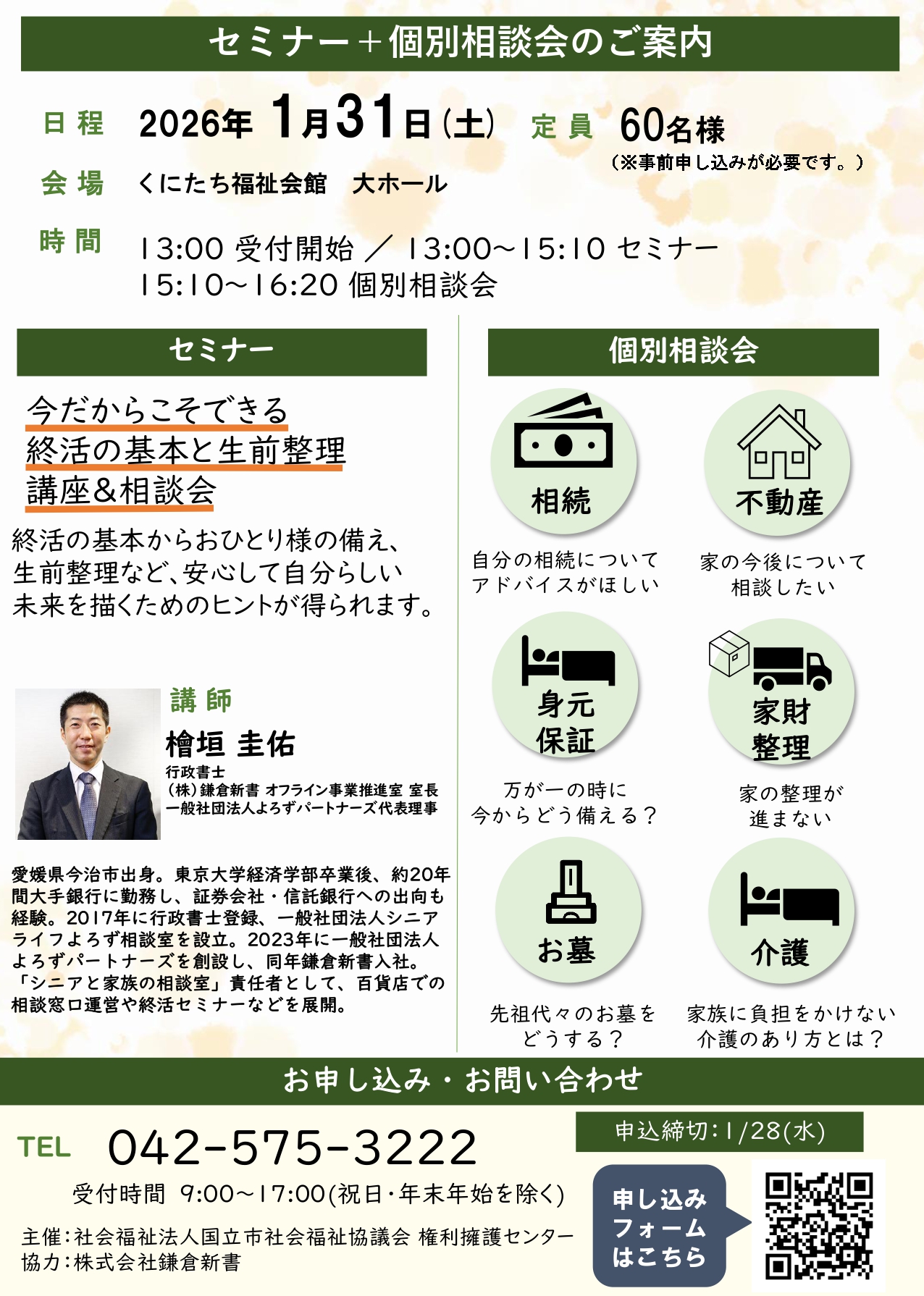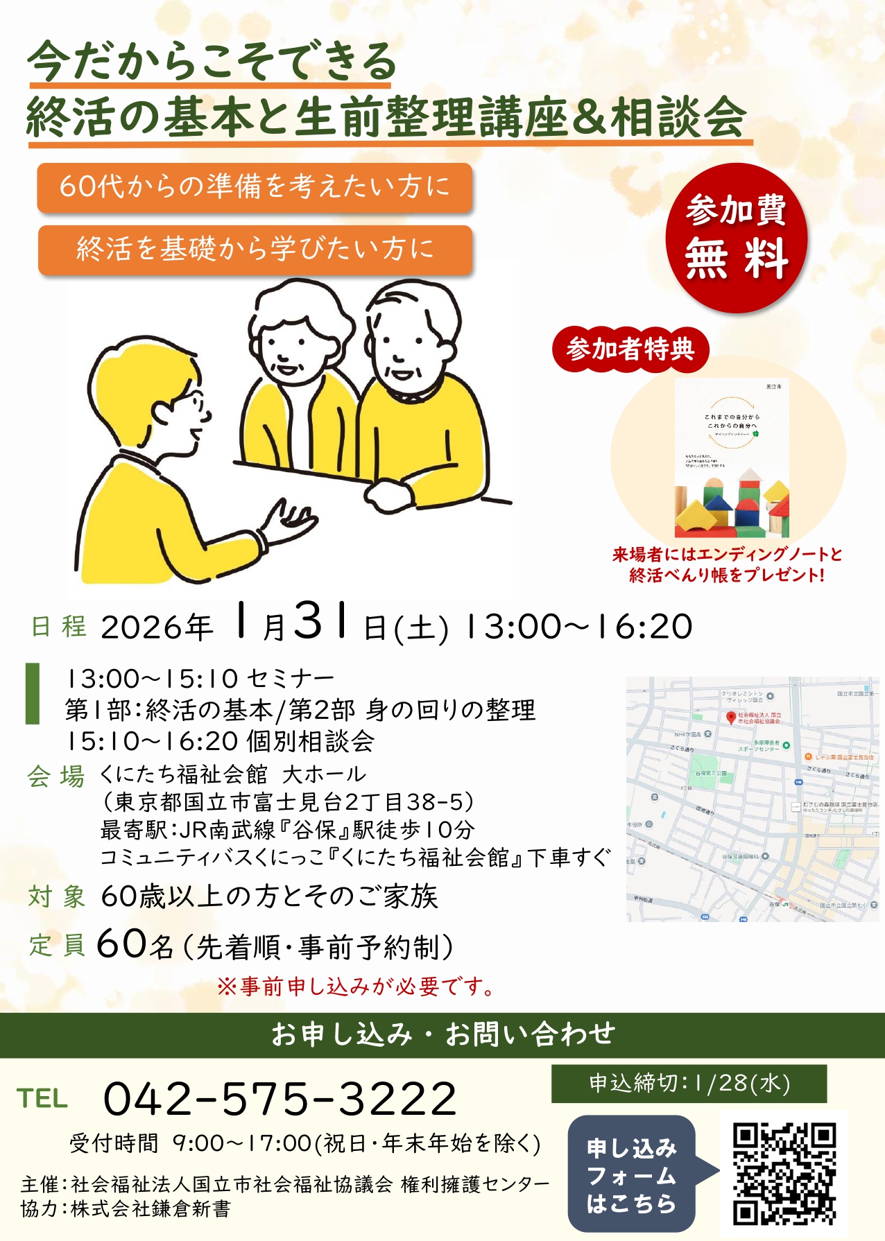 『終活の基本と生前整理講座&相談会』のお知らせ 2026.1.05 お知らせ これからの暮らしを安心して過ごすためのヒントを学び、専門家に相談できる「終活セミナー&相談会」を開催いたします。 第1部ではエンディングノートの書き方や生前整理、相続・葬儀の基本知識をわかりやすく解説。第2部では個別相談の時間を設け、みなさまのご質問に直接お答えします。 日時:1月31日(土) 午後1時00分〜4時20分 場所:福祉会館大ホール 対象:60歳以上の高齢者のみなさまとご家族 参加費:無料 申込方法:電話またはQRコード ———————————– 令和7年度 居場所サロンシンポジウム開催のお知らせ 一覧にもどる くにたち福祉会館 空調設備大規模改修工事のお知らせ